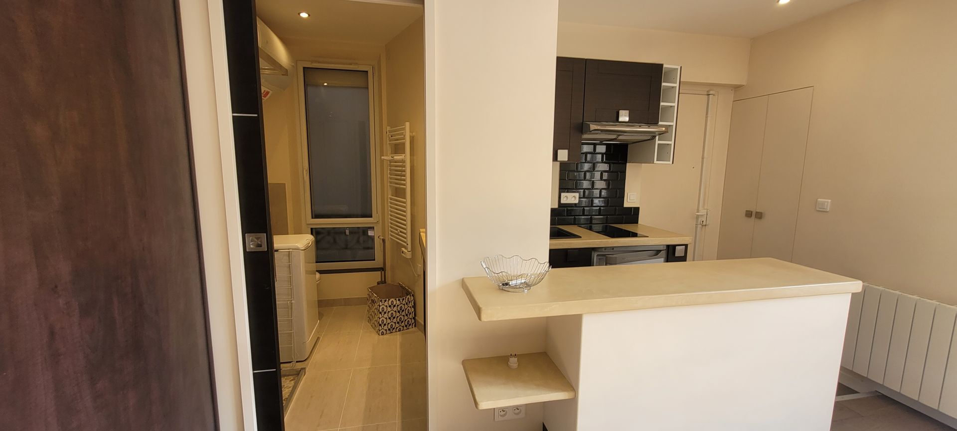 Pièce principale avec penderie, canapé convertible 160cm couchage quotidien, et cuisine ouverte équipée, salle d'eau avec grande vasque en pierre et wc, emplacement lave-linge à disposition. Chauffage individuel électrique.